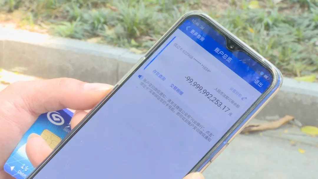 楊先生在今年2月中旬,經(jīng)朋友介紹來(lái)到深圳坪山工作,公司統(tǒng)一辦理了興業(yè)銀行的工資卡。楊先生說(shuō),第一個(gè)月發(fā)工資時(shí),他就發(fā)現(xiàn)工資取不出來(lái),就以為是銀行卡沒(méi)激活,沒(méi)在意。可是當(dāng)?shù)?月份的工資也用不了時(shí),楊先生趕緊下載了手機(jī)銀行,這一查,嚇了一跳!賬戶余額顯示:-99,999,992,253.17 (負(fù)999億余元)。