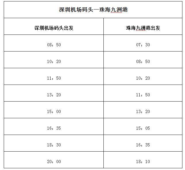 據(jù)深圳航運(yùn)集團(tuán)介紹,深圳機(jī)場碼頭至珠海九洲港航線開通后,每天共計8個航班16個航次往返兩地,服務(wù)時間從早上7時30分一直到晚上20時,基本實(shí)現(xiàn)公交化運(yùn)營。其中,由深圳機(jī)場碼頭出發(fā)的時間分別為8時50分、10時20分、11時50分、13時20分、15時、16時35分、18時30分和20時;由珠海九洲港出發(fā)的時間分別為7時30分、8時50分、10時20分、11時50分、13時20分、15時05分、16時35分及18時10分。