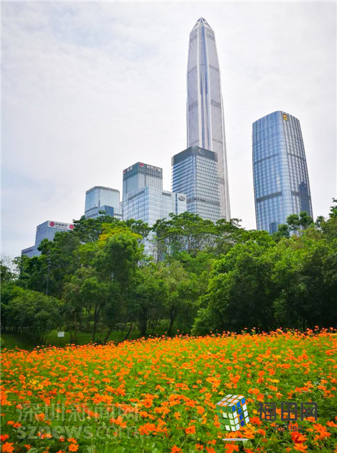 遠(yuǎn)處的平安大廈,近處的綠樹(shù)、花海,構(gòu)成了一副靜謐美好的畫面。