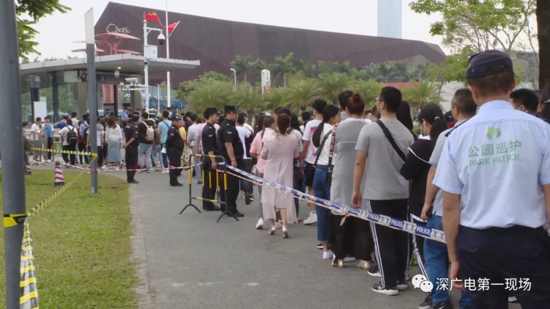 從下午5點(diǎn)半開始,園內(nèi)游客逐漸散去,深圳灣公園地鐵站兩個(gè)進(jìn)站口外,排隊(duì)的人都超過了百米,安保人員增設(shè)了鐵馬來維持現(xiàn)場(chǎng)秩序。
