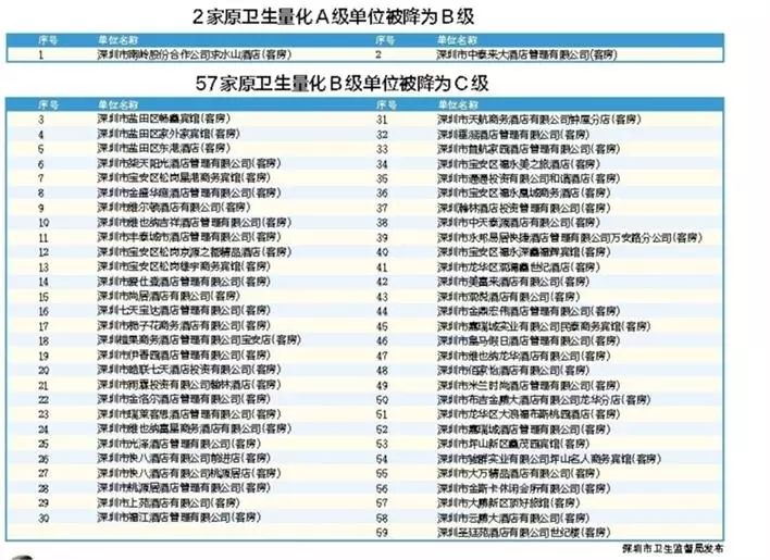 5、深圳市衛(wèi)生監(jiān)督部門(mén)自2018年12月開(kāi)始集中開(kāi)展專(zhuān)項(xiàng)整治行動(dòng)。截至目前,行動(dòng)中共檢查1660家酒店業(yè)單位,責(zé)令限期整改224家,立案95宗,共有59家單位在衛(wèi)生信譽(yù)等級(jí)評(píng)定復(fù)審工作中被予以“降級(jí)”,其中不乏部分知名連鎖酒店業(yè)單位。