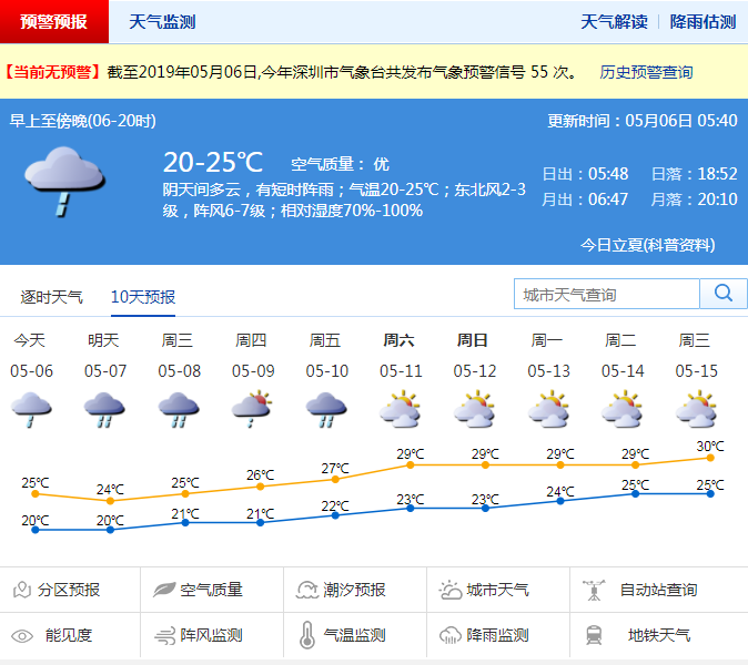 深圳新聞網(wǎng)2019年5月6日訊 記者從深圳市氣象臺了解到,隨著副熱帶高壓減弱,沿海偏南氣流加強,假期后我市天氣整體轉不穩(wěn)定,其中4日夜間到5日白天全市平均雨量16.5毫米;最大雨量出現(xiàn)在鹽田區(qū)東部華僑城站,為28.8毫米,沿海和高地陣風最大陣風達7-8級。