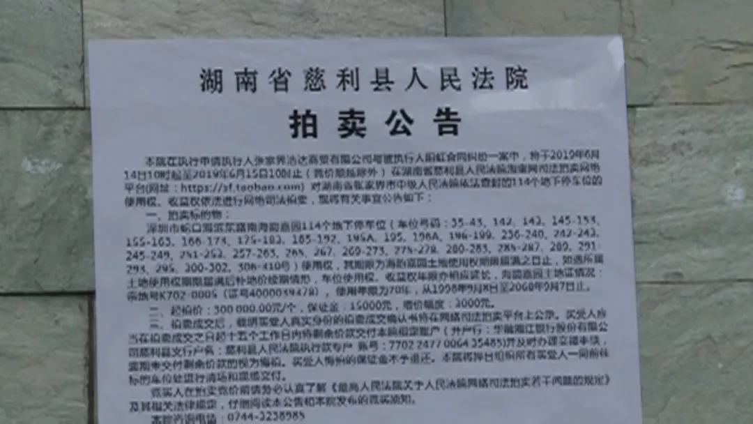 公告說,將強制拍賣114個停車位,網(wǎng)上拍賣時間是2019年6月14日至6月15日,落款是湖南省慈利縣人民法院。