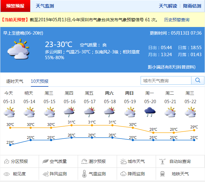 深圳新聞網(wǎng)2019年5月13日訊 深圳今日氣溫23-30℃,多云間陰天。市氣象臺預測,未來一周天氣持續(xù)炎熱,最高氣溫可達30-31 ℃。具體13-15日多云間晴天,早晚有輕霧,天氣炎熱,16-19日多云,部分時間有雷陣雨,中午前后天氣炎熱。