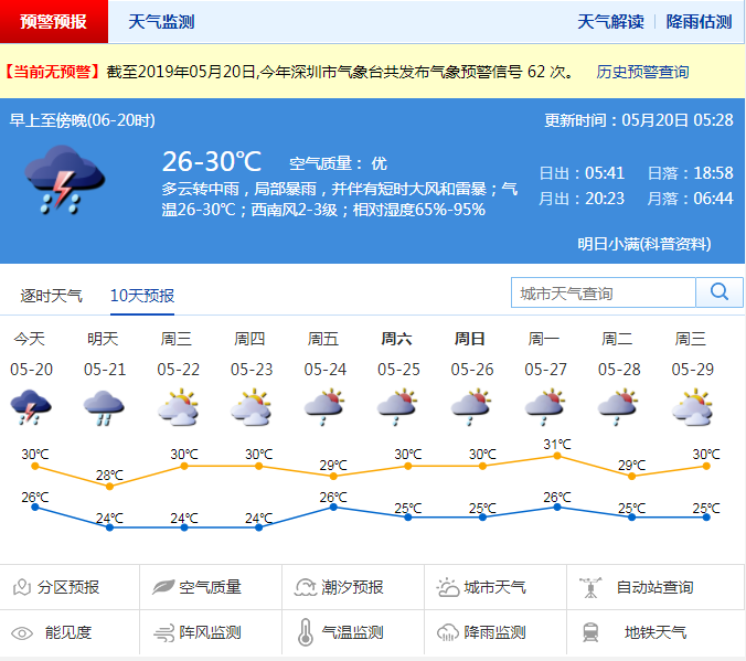 一年一度的“5·20”又來了,深圳近年來5月20日當(dāng)天局部暴雨以上的降雨的風(fēng)險較高。果然,受冷空氣影響,今天白天全市有降雨,局部地區(qū)降雨量級可達(dá)到大雨到暴雨,并伴有雷暴和8級左右短時大風(fēng),天氣較劇烈,雷雨過程恰逢周一上班,市民注意合理安排出行。氣溫在25℃-29℃,高溫暴曬天氣緩解。