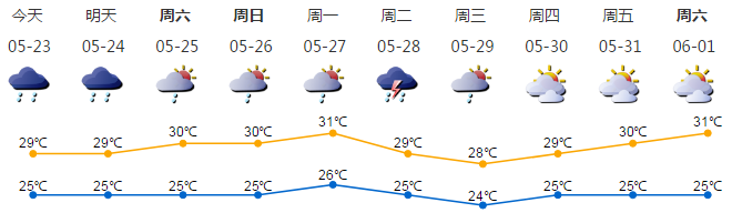 我市陰天間多云,有陣雨,部分時(shí)間雨勢(shì)較大;氣溫25-29℃;東南風(fēng)2-3級(jí);相對(duì)濕度65%-95%