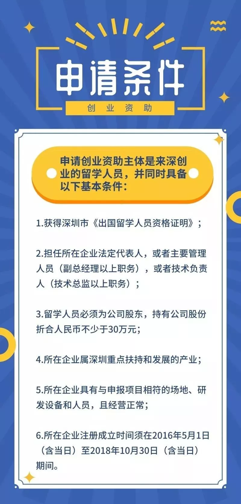 2.申請人或者申報(bào)單位曾獲得深圳市科技主管部門發(fā)放的科技研發(fā)資金中的留學(xué)人員創(chuàng)業(yè)資助、海外高層次人才創(chuàng)新創(chuàng)業(yè)資助等。