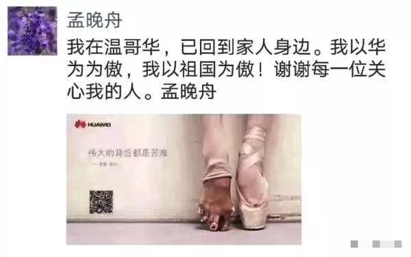 當(dāng)?shù)貢r(shí)間2018年12月1日,加拿大當(dāng)局應(yīng)美方要求,扣留了在加拿大機(jī)場(chǎng)轉(zhuǎn)機(jī)的孟晚舟,美國隨后承認(rèn),正在尋求對(duì)孟晚舟的引渡。10天之后,2018年12月11日,加拿大法院作出裁決,批準(zhǔn)孟晚舟的保釋申請(qǐng)。當(dāng)晚,走出法庭的孟晚舟發(fā)朋友圈表示,我以華為為傲,我以祖國為傲。配圖就是那張“芭蕾腳”的華為廣告圖,上面寫著:偉大的背后都是苦難。外界擔(dān)心,由于不斷升級(jí)的中美貿(mào)易摩擦,可能會(huì)影響到孟晚舟在加拿大的引渡訴訟。