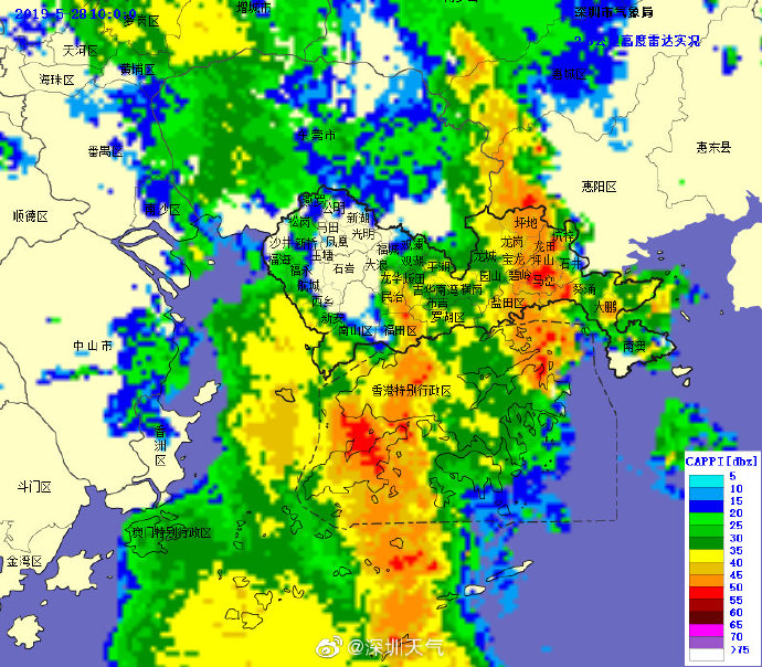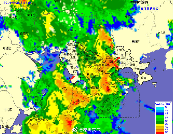 目前強降水中心已移至我市中部地區(qū),未來1-2小時內東部地區(qū)將出現(xiàn)20-40毫米降水,深圳市氣象臺于2019年05月28日09時15分將暴雨黃色預警擴展至全市,全市進入暴雨戒備狀態(tài),請注意防范。