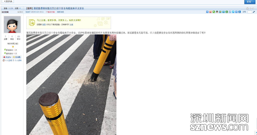 深圳新聞網(wǎng)2019年5月29日訊(記者 劉婷)“蓮花路景田東路交叉口這個安全島看起來不太安全?!苯眨W(wǎng)友“專打蒼蠅”在深圳論壇爆料稱,蓮花路景田東路交叉口安全島警示樁受損,存在安全隱患。5月29日,記者來到該路段實(shí)地勘察,發(fā)現(xiàn)安全島受損警示樁已全部整改。 (原帖文:蓮花路景田東路交叉口這個安全島看起來不太安全)