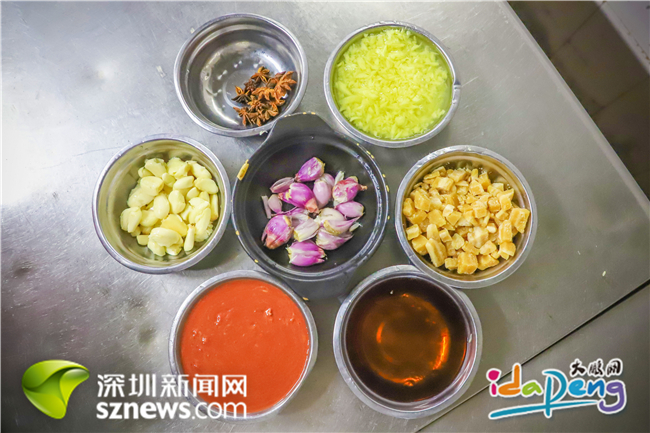 準(zhǔn)備好五花肉和燜好的芋頭,五花八門的材料也準(zhǔn)備輪番上場。歐石林將八角、料酒、醬油、鹽、姜蓉、蔥頭、蒜頭、南乳、片糖粒和花生油等細(xì)心地按比例分配在每個調(diào)料碟里,在他看來,一道好菜正是這些調(diào)料的“秀場”,但拿捏精準(zhǔn)卻不是件易事。