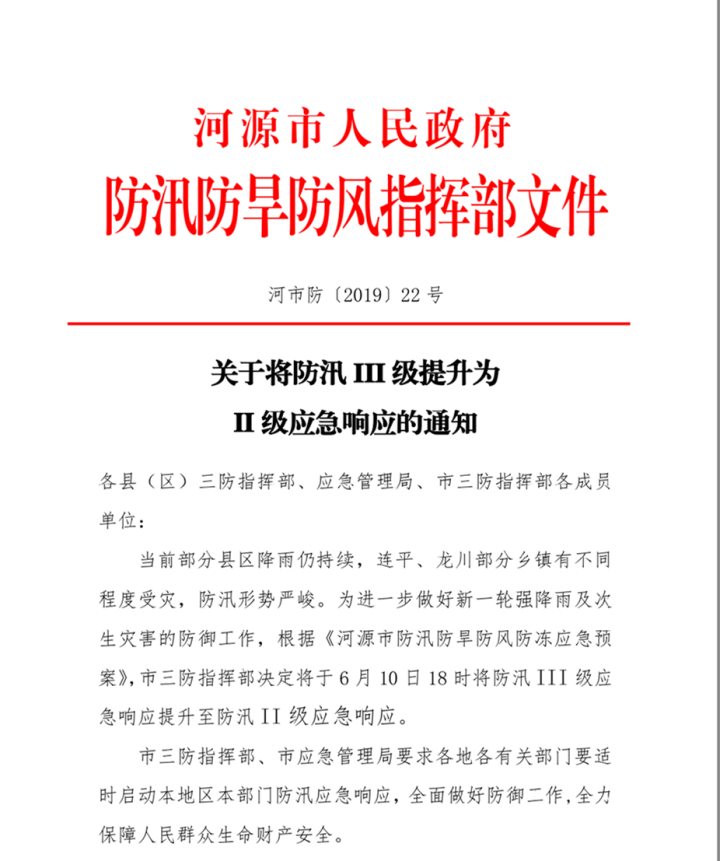 根據(jù)《河源市氣象災(zāi)害應(yīng)急預(yù)案》有關(guān)規(guī)定,市氣象災(zāi)害應(yīng)急指揮部決定于2019年6月10日14時(shí)10分將氣象災(zāi)害(暴雨)Ⅲ級(jí)應(yīng)急響應(yīng)升級(jí)為Ⅱ級(jí)應(yīng)急響應(yīng),請(qǐng)各有關(guān)部門和單位按照應(yīng)急預(yù)案規(guī)定的職責(zé),做好防御工作。