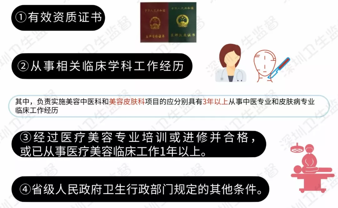(二)具有從事相關(guān)臨床學(xué)科工作經(jīng)歷。其中,負(fù)責(zé)實(shí)施美容外科項(xiàng)目的應(yīng)具有6年以上從事美容外科或整形外科等相關(guān)專(zhuān)業(yè)臨床工作經(jīng)歷;負(fù)責(zé)實(shí)施美容牙科項(xiàng)目的應(yīng)具有5年以上從事美容牙科或口腔科專(zhuān)業(yè)臨床工作經(jīng)歷;負(fù)責(zé)實(shí)施美容中醫(yī)科和美容皮膚科項(xiàng)目的應(yīng)分別具有3年以上從事中醫(yī)專(zhuān)業(yè)和皮膚病專(zhuān)業(yè)臨床工作經(jīng)歷;(三)經(jīng)過(guò)醫(yī)療美容專(zhuān)業(yè)培訓(xùn)或進(jìn)修并合格,或已從事醫(yī)療美容臨床工作1年以上;(四)省級(jí)人民政府衛(wèi)生行政部門(mén)規(guī)定的其他條件。