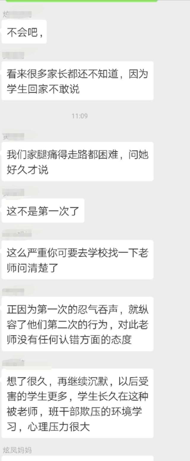 王先生把女兒的情況反映到家長(zhǎng)群里,結(jié)果群里的家長(zhǎng)紛紛表示,自己的孩子也反映當(dāng)天遭遇到班長(zhǎng)的毆打,有的孩子甚至“腿疼得難以走路”。