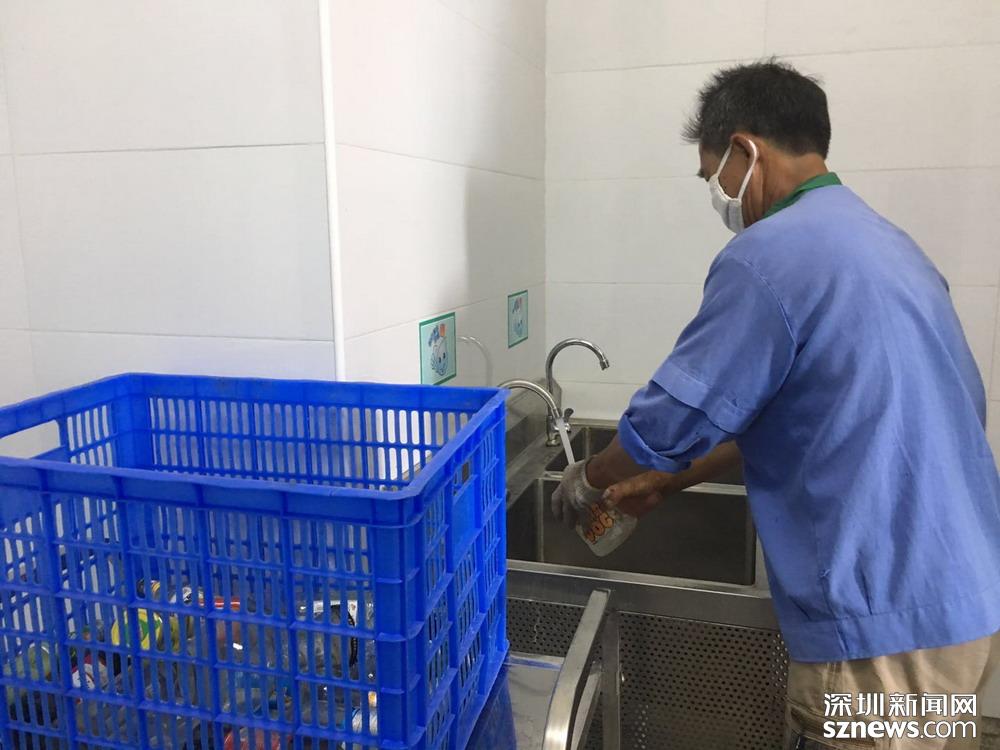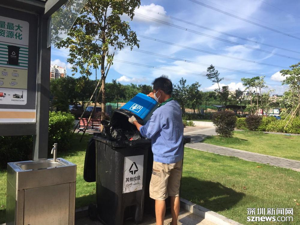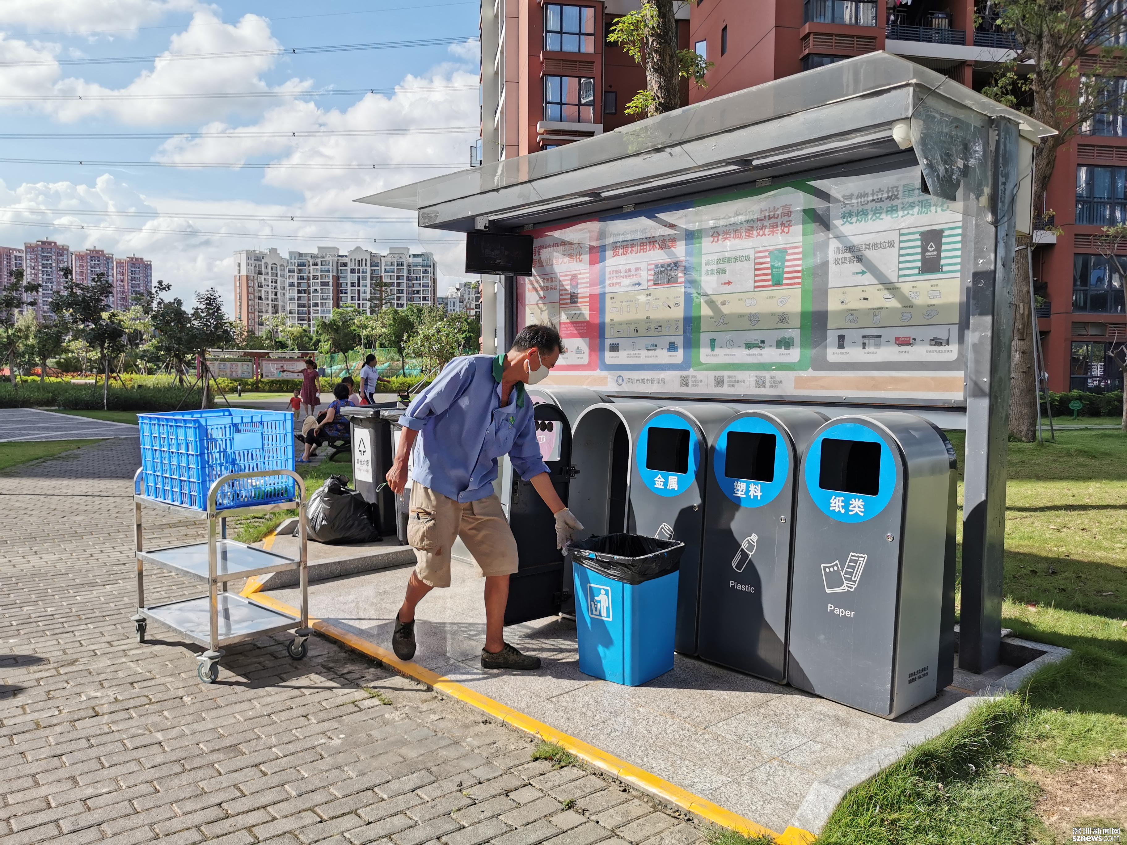 鄧伯今年60歲,是來(lái)深圳帶孫子的,因?yàn)槔习槟軒兔?,所以他?yīng)聘成為了一名小區(qū)清潔員。小區(qū)實(shí)行垃圾分類一年多以來(lái),鄧伯工作輕松了很多。每天他只需巡視幾遍垃圾桶,將滿了的垃圾裝在框里帶回暫存點(diǎn),進(jìn)行二次分揀和清洗后,再將垃圾桶歸放原處;等物業(yè)在微信平臺(tái)上聯(lián)系好運(yùn)送車輛,協(xié)助運(yùn)送人員運(yùn)走垃圾就行。