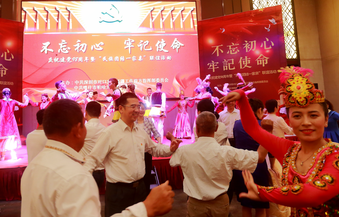 深圳新聞網(wǎng)2019年7月1日訊 盛夏七月,紅色黨旗迎風(fēng)飄,為積極響應(yīng)黨中央關(guān)于在全黨開展“不忘初心牢記使命”主題教育的重大部署。6月30日,深圳援疆前方指揮部、中共喀什市帕哈太克里鄉(xiāng)委員會聯(lián)合組織開展慶祝建黨98周年暨“民族團結(jié)一家親聯(lián)誼”活動??κ驳貐^(qū)行署領(lǐng)導(dǎo)、全體援疆干部人才、帕哈太克里鄉(xiāng)結(jié)親群眾等300余人參與活動。