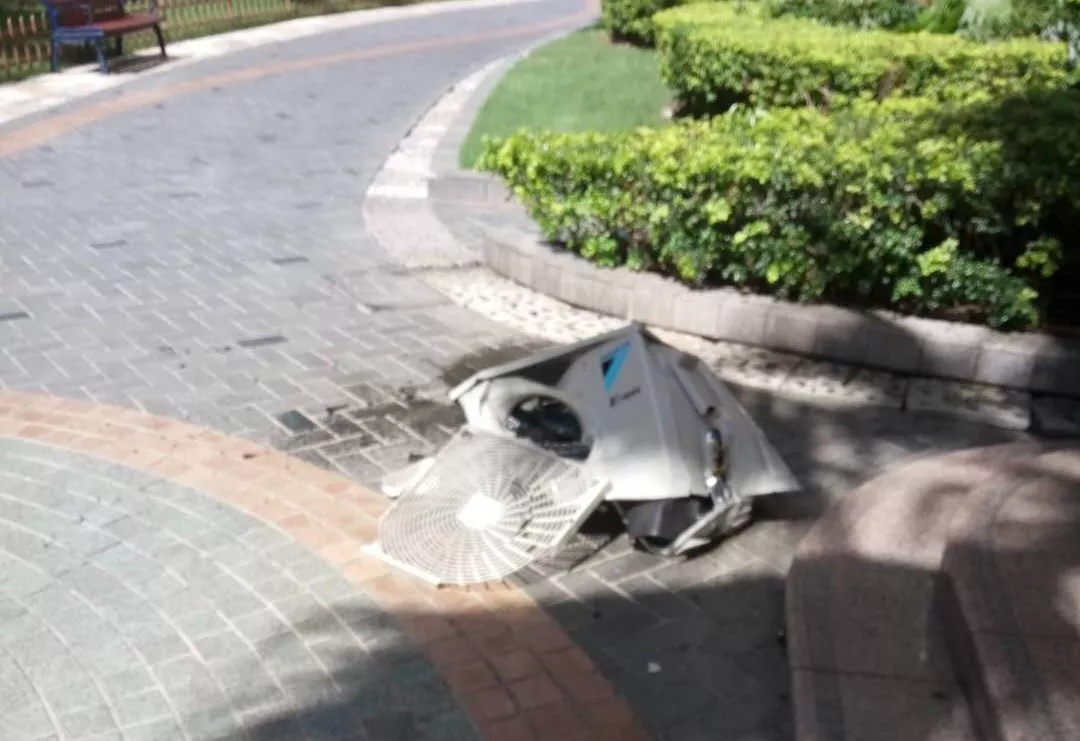 據(jù)了解,空調(diào)主機(jī)從2棟中間樓層的一戶業(yè)主家掉落的,當(dāng)時(shí)安裝工人正在挪動(dòng)主機(jī),中途意外脫手,萬(wàn)幸沒(méi)有傷到人。