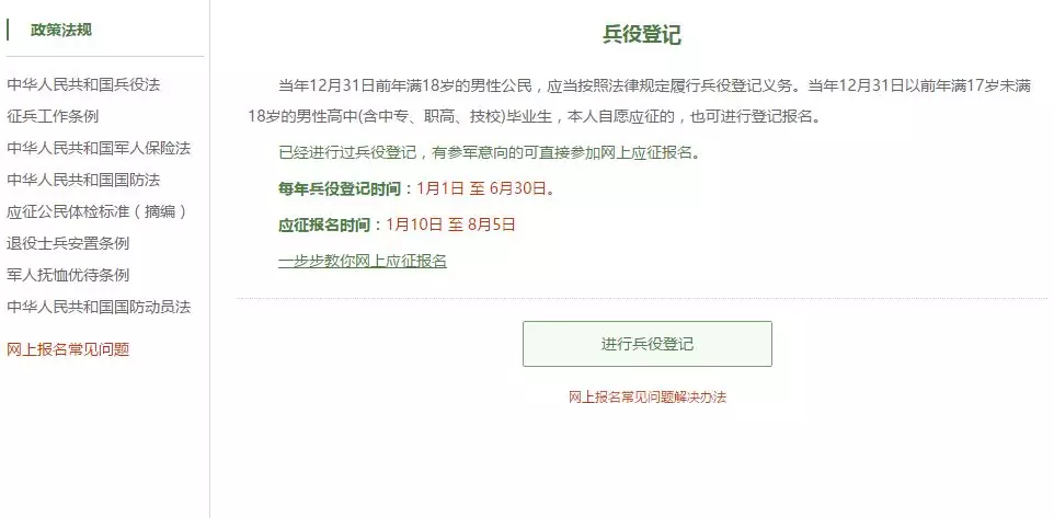 在這個(gè)頁(yè)面中,會(huì)告知我們報(bào)名時(shí)間以及參軍的政策說(shuō)明,建議看后,點(diǎn)擊“進(jìn)行兵役登記”,邁出你軍旅生涯的第一步吧!