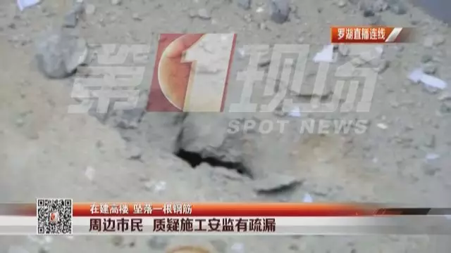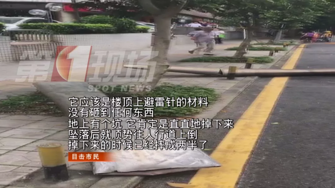 據(jù)目擊者介紹,在羅湖帝豪金融大廈附近,一根建筑鋼筋突然從高空墜落,砸在了路邊,連水泥地面都被鋼筋戳穿一個洞。