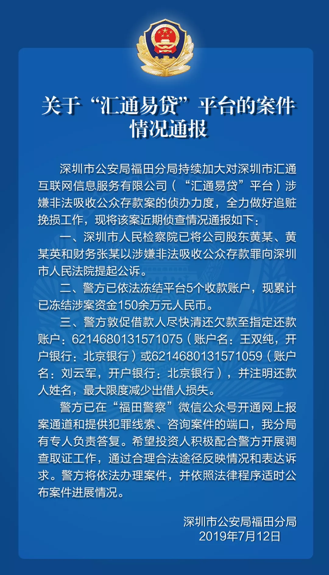 關于“匯通易貸”平臺的案件情況通報