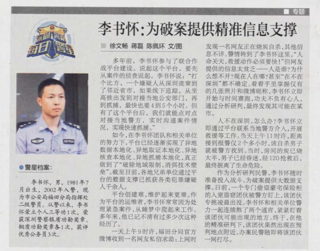 一天上午9時(shí)許,福田分局官方微博收到一名網(wǎng)友私信求助:上網(wǎng)時(shí)發(fā)現(xiàn)一名網(wǎng)友正在燒炭自殺,其他信息不詳。警情轉(zhuǎn)到了李書懷這里,“人命關(guān)天,救援動(dòng)作必須要快!”但網(wǎng)友提供的信息太貧乏——人是誰(shuí)?為什么想不開?現(xiàn)在人在哪?甚至“在不在深圳”都不確定。看著手里掌握僅有的幾張照片和微博昵稱,李書懷立即開始與時(shí)間賽跑,功夫不負(fù)有心人,通過分析研判,最終發(fā)現(xiàn)其可能在某市。