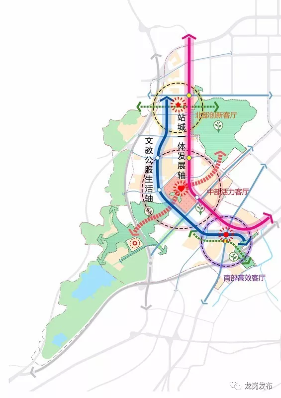 總體城市框架中的“兩軸”為黃閣路“站城一體發(fā)展軸”和龍飛大道“文教公服生活軸”。