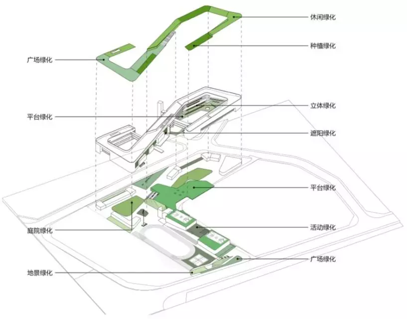 同時利用場地地形的天然高差,通過對地形的處理形成大量學生休閑活動的場所,將廣場、休閑架空層、下沉庭院、景觀臺地、風雨連廊、屋頂花園等空間連接成為一個連續(xù)而多樣化的空間體系,使得學生可以在校園內(nèi)風雨無阻地通行。
