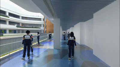 龍華區(qū)行知學校用地被西側(cè)的城市綠地、東南角的獅徑公園所包裹,具備天然的景觀優(yōu)勢。在內(nèi)部布局中,將場地、屋頂、架空層、立面結(jié)合起來,賦予多層次的綠化空間,打造真正的綠色校園。