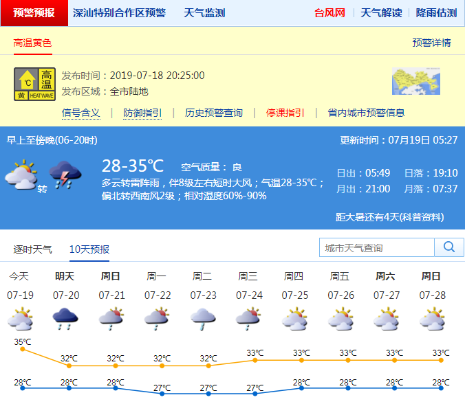 深圳新聞網(wǎng)2019年7月19日訊 受臺風(fēng)外圍下沉氣流影響,19日多云為主,天氣酷熱;受西南氣流影響,午后有雷雨,雨時伴有短時強降水和8級左右大風(fēng);氣溫28-35℃,中北部和人口密集區(qū)最高氣溫可達37℃以上。18日白天,全市氣溫普遍在35℃~37℃左右,其中最高氣溫達到39.6℃。高溫橙色預(yù)警信號繼續(xù)生效中。