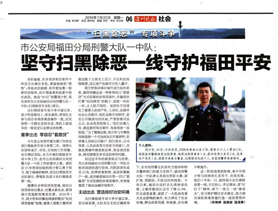 今年是公安部開展為期三年的全國掃黑除惡專項斗爭的第二年。按照公安部和省廳、市局、分局的工作部署,結(jié)合轄區(qū)實際,全力開展掃黑除惡專項斗爭工作,是市公安局福田分局刑警大隊一中隊工作的重中之重。擁有近10年刑偵經(jīng)驗的周少哲以勇于擔(dān)當、敢于碰硬的精神,擔(dān)任掃黑除惡專業(yè)隊探長,帶領(lǐng)隊員戰(zhàn)斗在掃黑除惡第一線。
