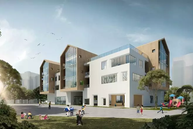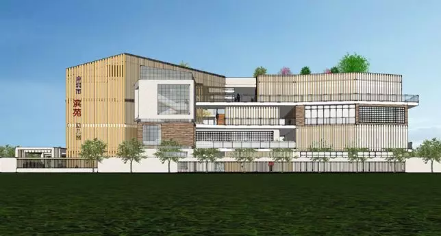 建筑造型簡潔現(xiàn)代,在白色體量上嵌入三個木色坡屋頂體塊,如積木城堡一般,富有童趣,建筑設(shè)有集中活動平臺作為補(bǔ)充。