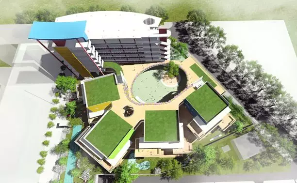 室外環(huán)境設(shè)有滿足孩子們的橡膠跑道、人工草坪,大型娛樂滑梯設(shè)施等等,各層也設(shè)置了公共平臺,為幼兒提供多樣化的樂趣,滿足幼兒好奇、好動、好模仿的特點。在屋頂設(shè)置了綠植與小型趣味玩具區(qū),讓幼兒接觸自然,喜歡自然。