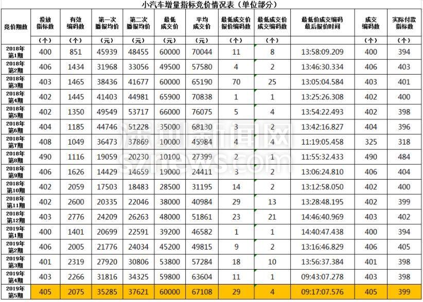 小汽車增量指標(biāo)競(jìng)價(jià)情況表單位部分(2018年第一期——2019年第五期)