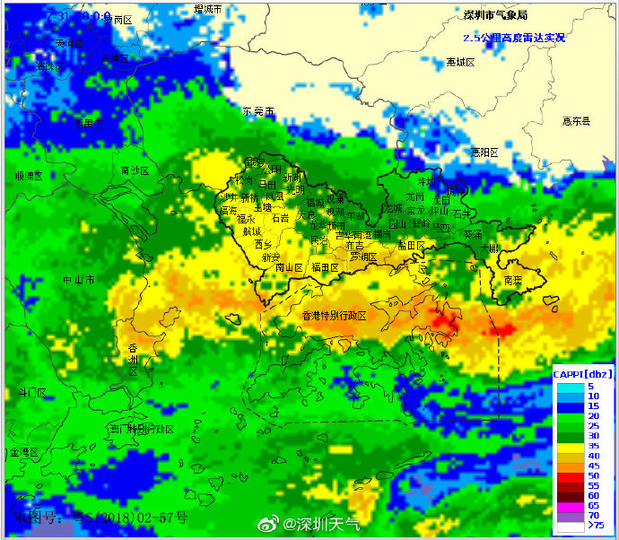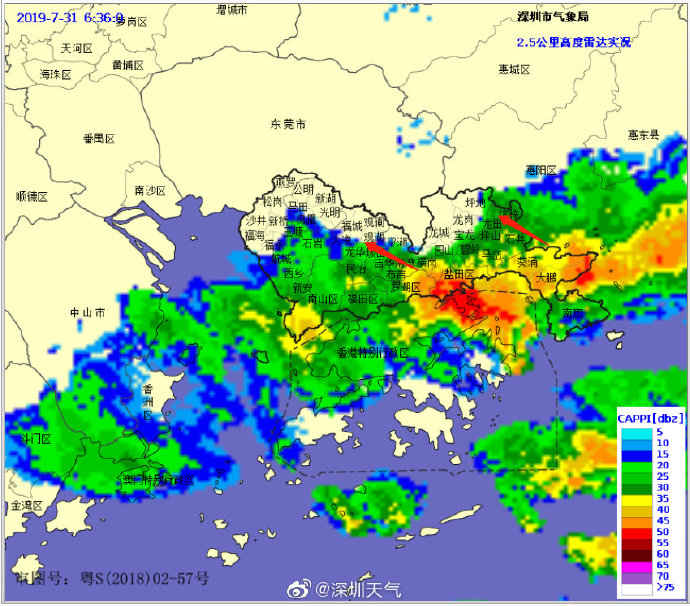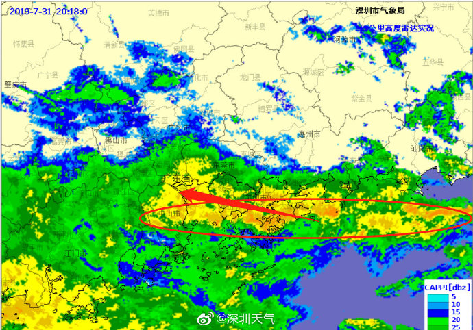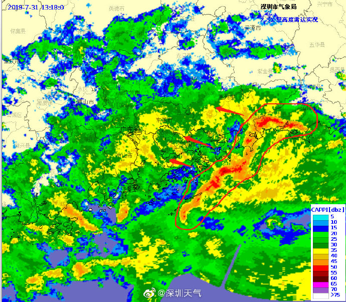 當(dāng)一條雨帶的長軸和雨帶的移動方向(箭頭)夾角很小時,某個地方就會被這條雨帶幾乎從頭到尾地經(jīng)過,于是這個地方的累計(jì)雨量就會特別大。而現(xiàn)在深圳靠南的大部分區(qū)域就在經(jīng)歷一場列車效應(yīng),所以這場雨持續(xù)時間比較長,短時間內(nèi)停不下來。