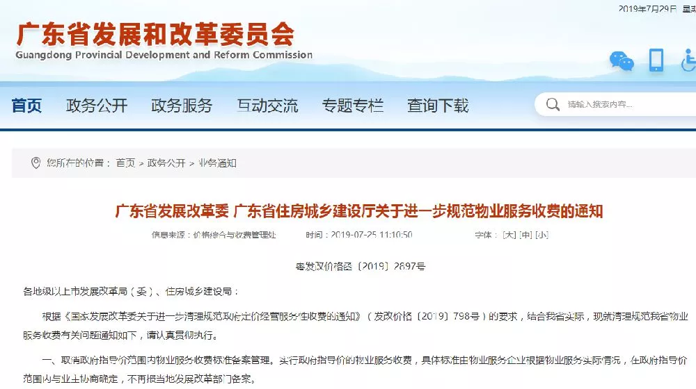 廣東省物業(yè)服務(wù)收費(fèi)規(guī)范新規(guī)定自2019年8月1日起執(zhí)行。實(shí)行政府指導(dǎo)價的物業(yè)服務(wù)收費(fèi),具體標(biāo)準(zhǔn)由物業(yè)服務(wù)企業(yè)根據(jù)物業(yè)服務(wù)實(shí)際情況,在政府指導(dǎo)價范圍內(nèi)與業(yè)主協(xié)商確定,不再報(bào)當(dāng)?shù)匕l(fā)展改革部門備案。