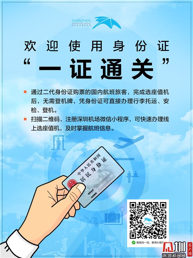 深圳新聞網(wǎng)2019年8月1日訊(見圳客戶端、深圳新聞網(wǎng)記者 涂勝 通訊員 葉丹)記者從深圳機場了解到,即日起,深圳機場全面試行國內(nèi)航班身份證“一證通關(guān)”服務(wù)。今后,使用二代身份證購買機票的旅客,在完成選座值機后,僅需出示身份證即可直接辦理行李托運、安檢和登機手續(xù),全程無需再出示登機牌。