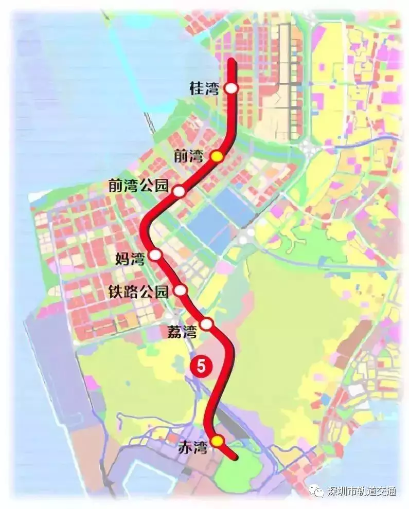 地鐵5號線南延段,即5號線二期工程,北起于5號線前海灣站,經(jīng)前海、南山,終點(diǎn)與地鐵2號線赤灣站換乘。線路全長約7.7千米,全線采用地下敷設(shè)方式。該線路設(shè)站7座,分別為:赤灣、荔灣、鐵路公園、媽灣、前灣公園、前灣、桂灣。