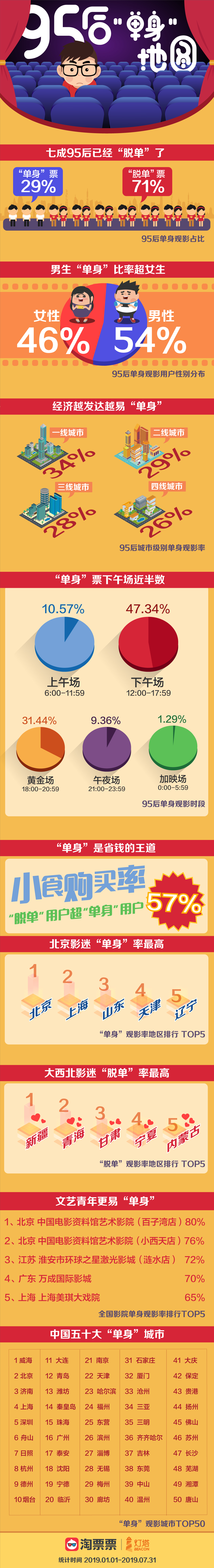 淘票票及燈塔專(zhuān)業(yè)版的數(shù)據(jù)顯示,在95后觀影人群中,有29%的用戶購(gòu)買(mǎi)“單身票”(僅買(mǎi)一張票)觀影,而71%的95后均選擇購(gòu)買(mǎi)兩張及以上電影票來(lái)觀影;在獨(dú)身觀影用戶中,男性以54%的占比超過(guò)女性8個(gè)百分點(diǎn);情感狀態(tài)也在一定程度上決定了用戶的觀影習(xí)慣。報(bào)告數(shù)據(jù)顯示,95后“單身”用戶集中在白天觀影,僅下午場(chǎng)(12:00-17:59)占比就達(dá)到47.34%,而晚9點(diǎn)后的夜場(chǎng)份額占比僅1成左右。
