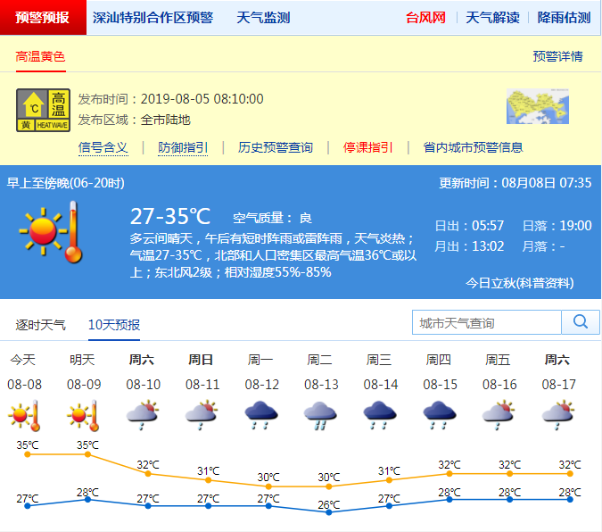 見圳客戶端·深圳新聞網(wǎng)2019年8月8日訊 隨著第9號臺風“利奇馬”逐漸靠近,深圳逐漸受其外圍偏北下沉氣流影響,預計8-9日深圳市高溫加劇,晴天間多云,有輕微至輕度霾,氣溫28-35℃,北部和人口密集地區(qū)最高氣溫37℃以上,午后局地有熱雷雨,雨時伴有短時大風。