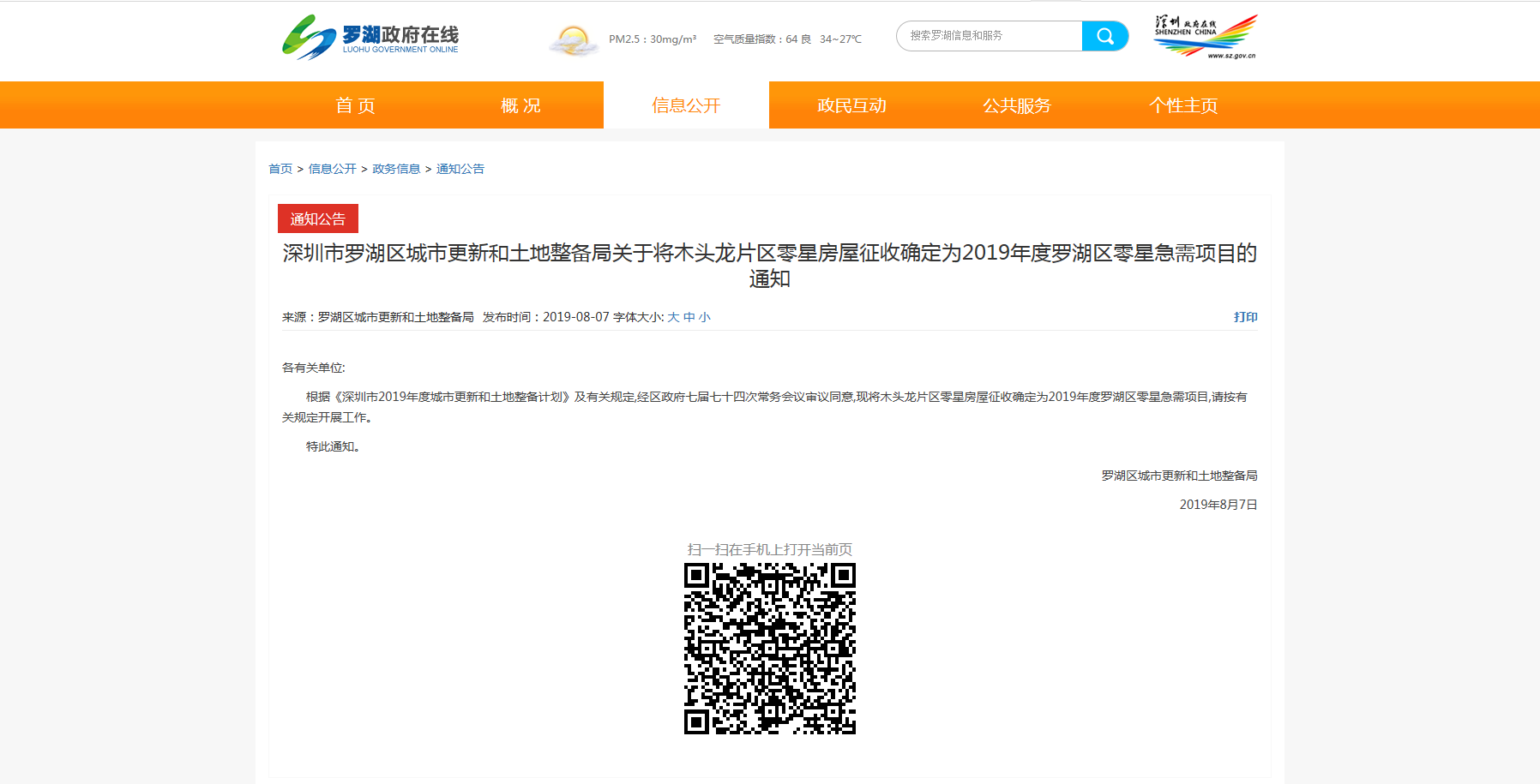“經(jīng)過全面分析,木頭龍項目涉及眾多公共利益、現(xiàn)狀存在重大社會風(fēng)險的情況下,根據(jù)《深圳市2019年度城市更新和土地整備計劃》房屋征收專項計劃中明確的‘考慮到各區(qū)公共利益項目的急需,各區(qū)區(qū)級房屋征收計劃可安排零星急需項目1項’,羅湖區(qū)政府將木頭龍片區(qū)零星房屋征收確定為2019年度羅湖區(qū)零星急需項目,并啟動征收程序,盡快破解重大歷史遺留難題,防范和化解重大風(fēng)險,落實(shí)項目配套的交通設(shè)施、保障性住房等急需公共利益。”他說,政府將依法依規(guī)實(shí)施房屋征收并進(jìn)行征收補(bǔ)償,保障被征收人的合法權(quán)益。