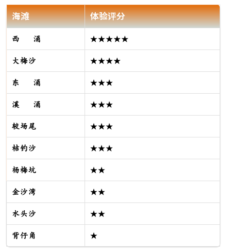 連日來(lái),記者兵分多路,以自西向東、距離市區(qū)“由近及遠(yuǎn)”的方向沿海暴走,對(duì)其中10個(gè)知曉率最高的海灘進(jìn)行體驗(yàn)式走訪,以“開放情況、是否收費(fèi)、能否停車、便民服務(wù)、沙灘清潔、海域安全”六個(gè)方面為指標(biāo),以五星為滿分進(jìn)行了好感度評(píng)分。