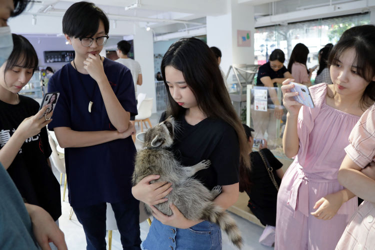 除了小動物和飼養(yǎng)員們,這里還聚集了許多年輕女孩兒,她們有的相互認(rèn)識,輪流跟店里的小浣熊撓癢癢拍照;有的不認(rèn)識彼此,卻因?yàn)轱曫B(yǎng)過同樣的小動物而熟絡(luò)起來,相互傳授養(yǎng)育自家"孩子"的經(jīng)驗(yàn)。這只名為"六一"的小浣熊是這里的常駐小動物,面對市民們的熱情,"六一"毫不客氣地躺在小姐姐的臂彎里撒嬌,引來其他市民們爭相拍照。