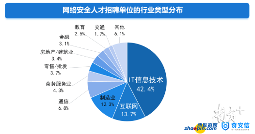 從用人單位的所屬行業(yè)來看,IT信息技術(shù)和互聯(lián)網(wǎng)行業(yè)對(duì)網(wǎng)絡(luò)安全人才需求量明顯高于其他行業(yè),分別占到了總量的42.4%和13.7%。需求排名第三的是制造業(yè),招聘數(shù)量占比12.3%。通信行業(yè)(6.8%)、商務(wù)服務(wù)業(yè)(4.3%)等排在其后。