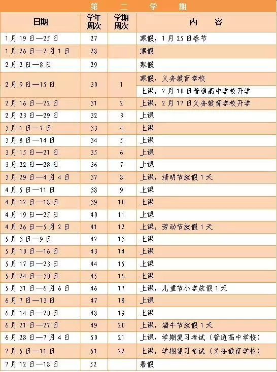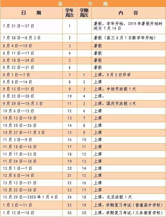 第一學(xué)期年20周,2019年9月1日至9月7日為第一學(xué)期第1周,9月2日開學(xué),寒假?gòu)?020年1月19日開始;第二學(xué)期22周,2020年2月9日至2月15日為第二學(xué)期第1周,2月10日開學(xué),暑假?gòu)?020年7月12日開始。