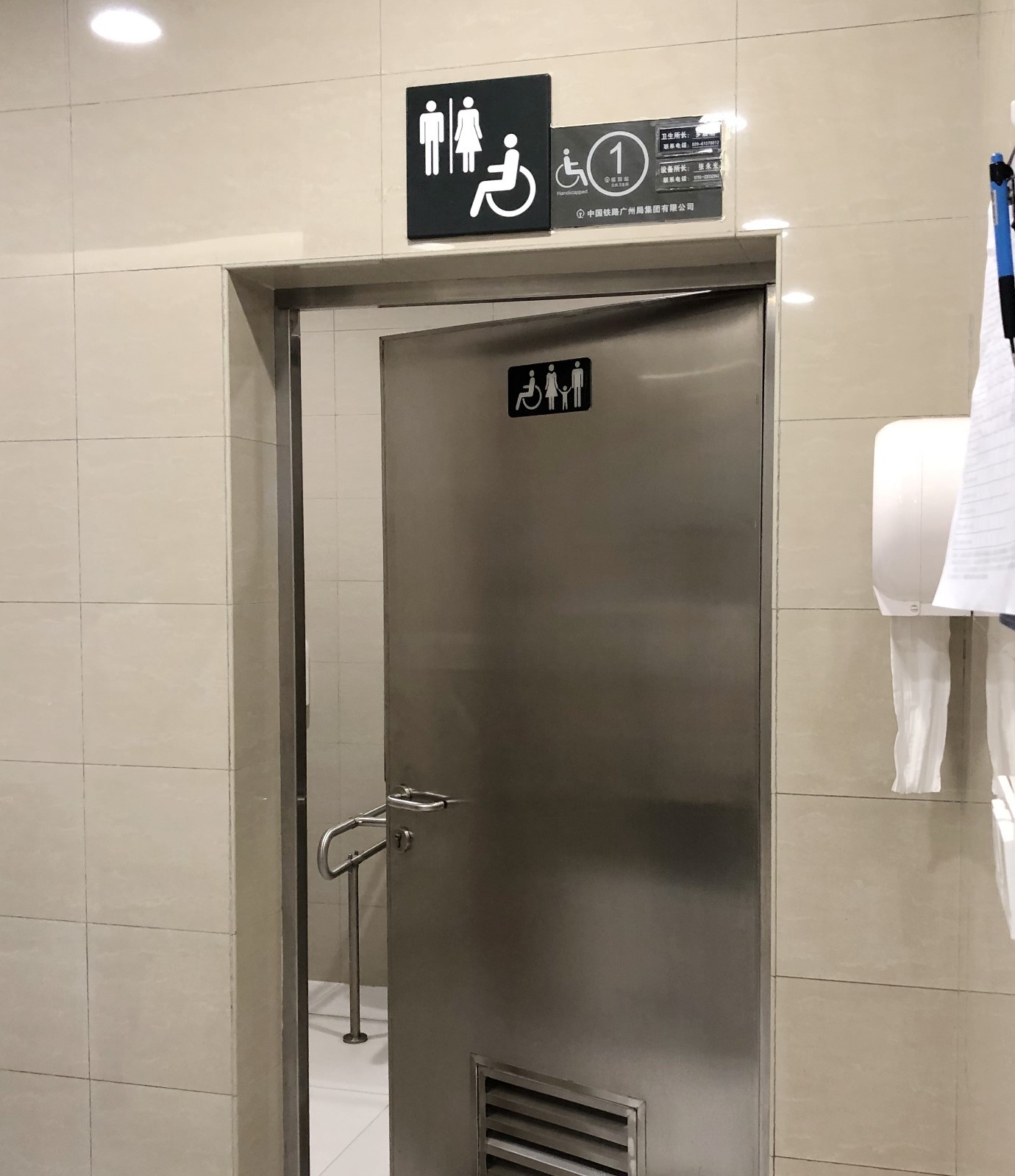 ▲同時(shí)記者留意到,在高鐵站沿路的洗手間指引標(biāo)識(shí)牌上,僅標(biāo)注了男女洗手間和殘疾人洗手間的標(biāo)識(shí),卻沒(méi)有第三方洗手間的指引標(biāo)識(shí),只有在殘疾人洗手間的門上才能看到“一家三口手拉手”的圖案標(biāo)識(shí),不方便有需要的市民“按圖索驥”。且該洗手間位置處于男洗手間入口通道內(nèi),如果女性帶孩子進(jìn)入使用,不免有些尷尬。