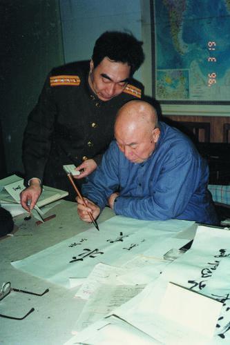 ▲1996年軍旅作家吳東峰(左)到開國(guó)上將肖克(右)家中采訪時(shí),蕭克將軍在他墨香陣陣的書房?jī)?nèi)給他寫下‘求實(shí)’兩個(gè)大字。