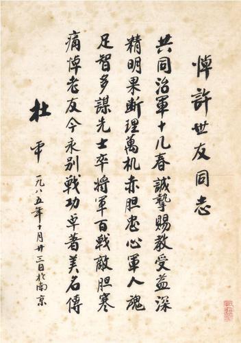 在采訪一位又一位身經(jīng)百戰(zhàn)的幸存者時(shí),吳東峰與他們的筆墨緣也就此結(jié)下。“1985年許世友將軍因病逝世,杜平將軍親手書寫‘悼許世友同志’詩(shī)一首,請(qǐng)我送《人民日?qǐng)?bào)》刊登,我把詩(shī)傳真過去,原件保存下來(lái)了。這首詩(shī)見證了杜平與許世友的深厚友情,是我最早的將軍墨跡手藏。那之后,我開始有意識(shí)地收集將軍們的筆墨?!?/p>