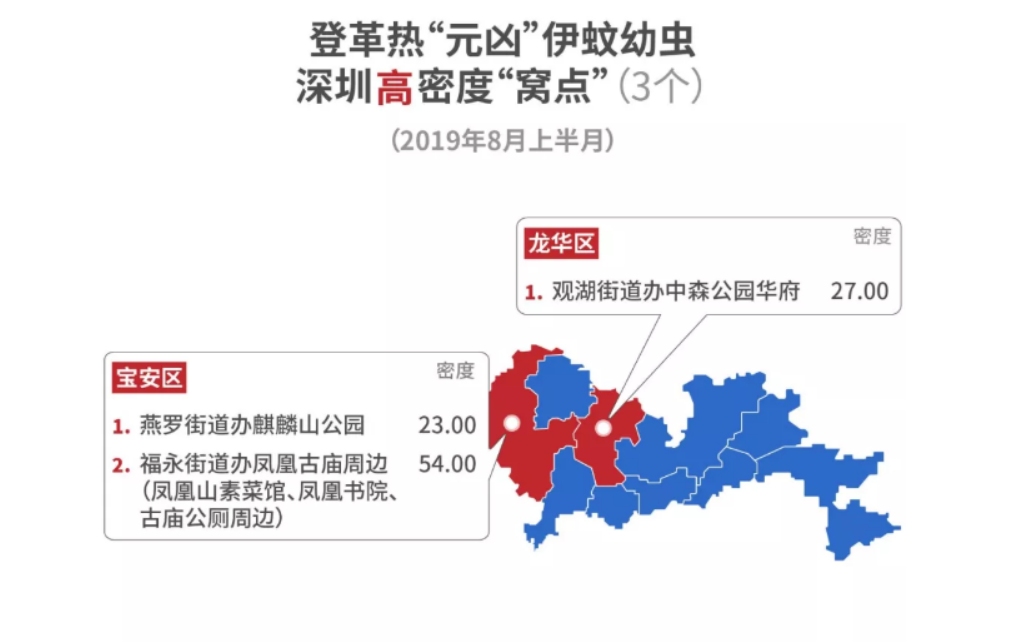 2019年8月1日-15日,通過對(duì)全市419個(gè)監(jiān)測(cè)點(diǎn)進(jìn)行伊蚊密度監(jiān)測(cè),發(fā)現(xiàn)深圳蚊媒密度總體較高,不符合防控要求的監(jiān)測(cè)點(diǎn)有237個(gè),占了56.56%,其中——高傳播風(fēng)險(xiǎn)的有3個(gè)點(diǎn);中度傳播風(fēng)險(xiǎn)的有64個(gè)點(diǎn);低度傳播風(fēng)險(xiǎn)的有179個(gè)。