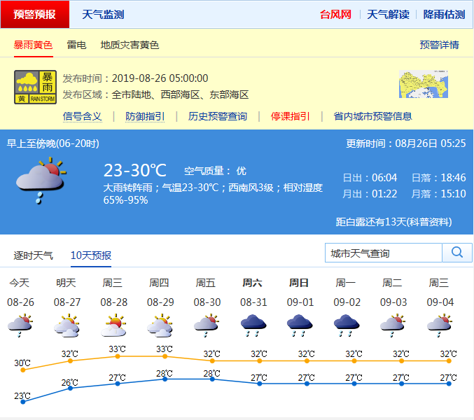 見圳客戶端·深圳新聞網(wǎng)2019年8月26日訊 今年第11號臺風“白鹿”已經(jīng)于昨日7時25分在福建省東山縣沿海登陸后,已減弱為熱帶低壓,向西偏北方向移動,市氣象臺已于昨日17時取消臺風白色預警信號。據(jù)市氣象局預計,今日白天大雨轉陣雨,降雨減弱;27-29日多云間晴天,天氣趨于悶熱。