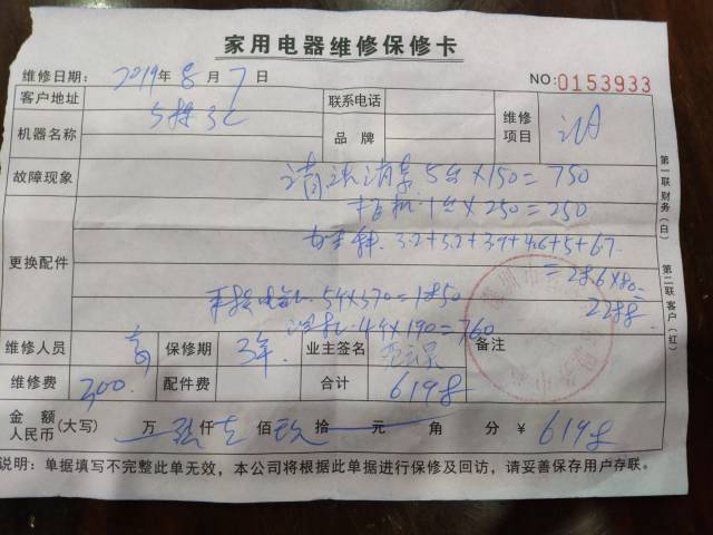 藍先生的妹妹在58同城小助手,找到了深圳市易臣國際貨運代理有限公司,并預約了上門清洗空調(diào)的服務(wù)。當師傅上門以后,除了清洗外,還說空調(diào)存在多個問題,如需要加雪種(學名“氟利昂”)、線路老化、空調(diào)漏水等,6臺空調(diào)整體清洗加修理下來,藍小姐當天共花費6618元。